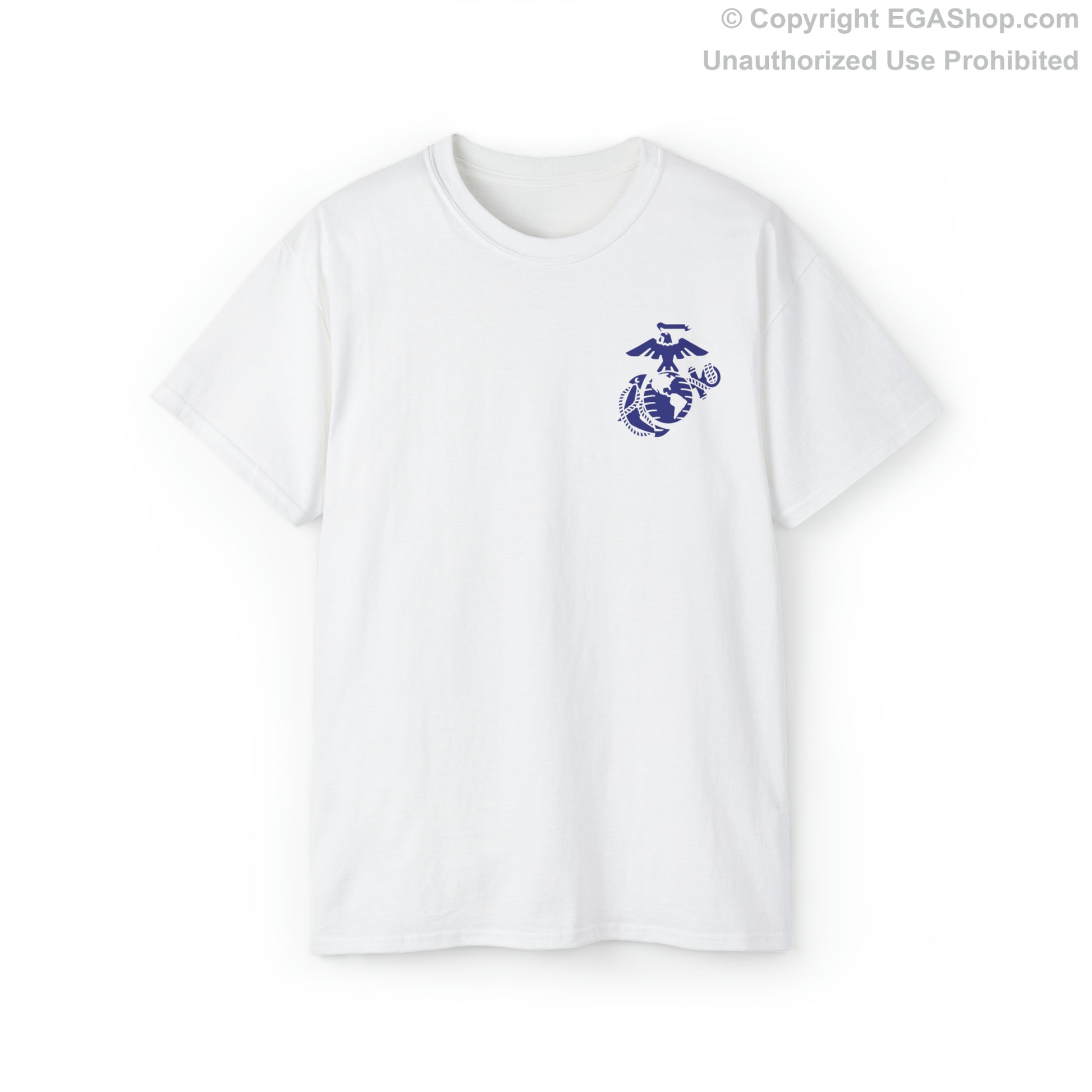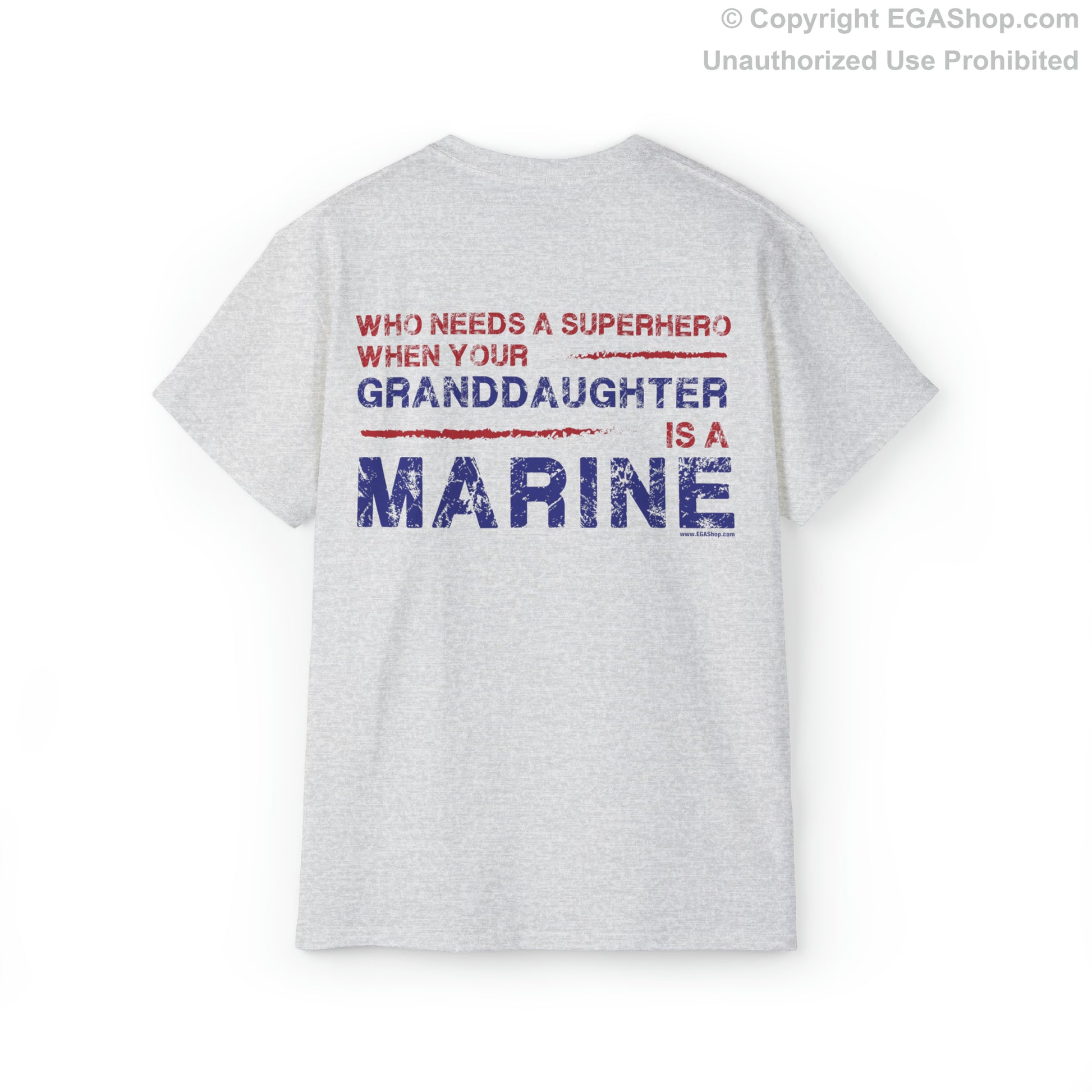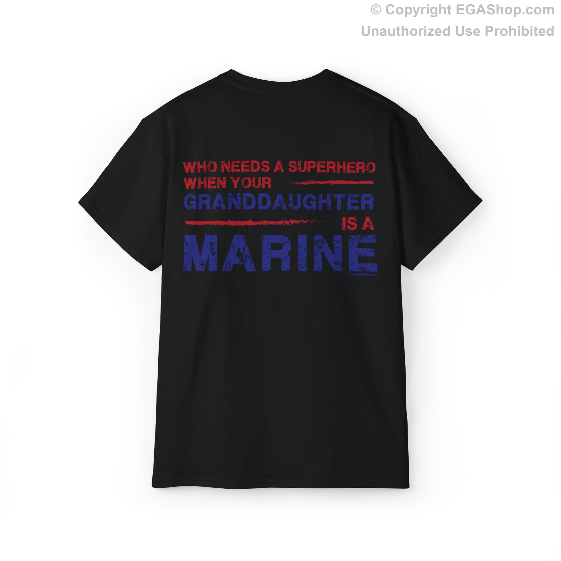 This unisex cotton tee is a classic for Marine Corps Graduations. The back reads, "Who Needs a Superhero When Your GRANDDAUGHTER is a Marine." The front features the Marine Corps Eagle, Globe, and Anchor (EGA) in blue, pocket-sized, on the upper left. On the black and charcoal shirt, the EGA is white, and the text on the back is intended to be muted. Fits true-to-size.