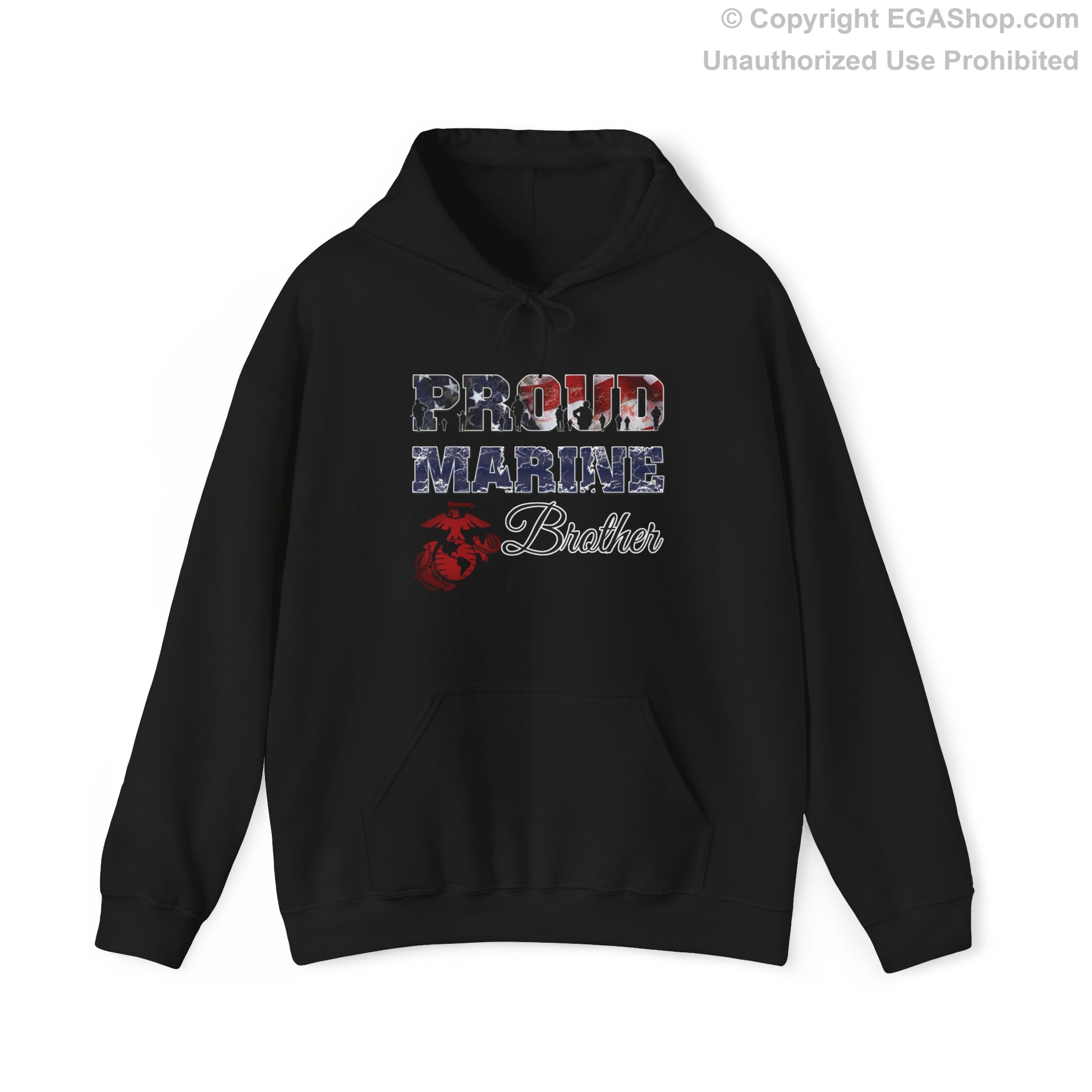 Our Proud Marine Brother hoodie features the word PROUD as an American flag with silhouettes of Marines in front; below is the word MARINE Brother next to a red Eagle, Globe, and Anchor (EGA). The EGA is muted on darker color fabric. The back is blank. In your choice of colors. An EGA Shop exclusive.