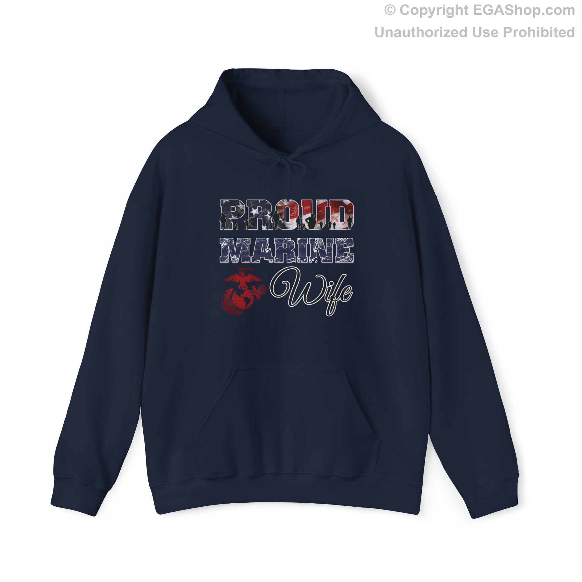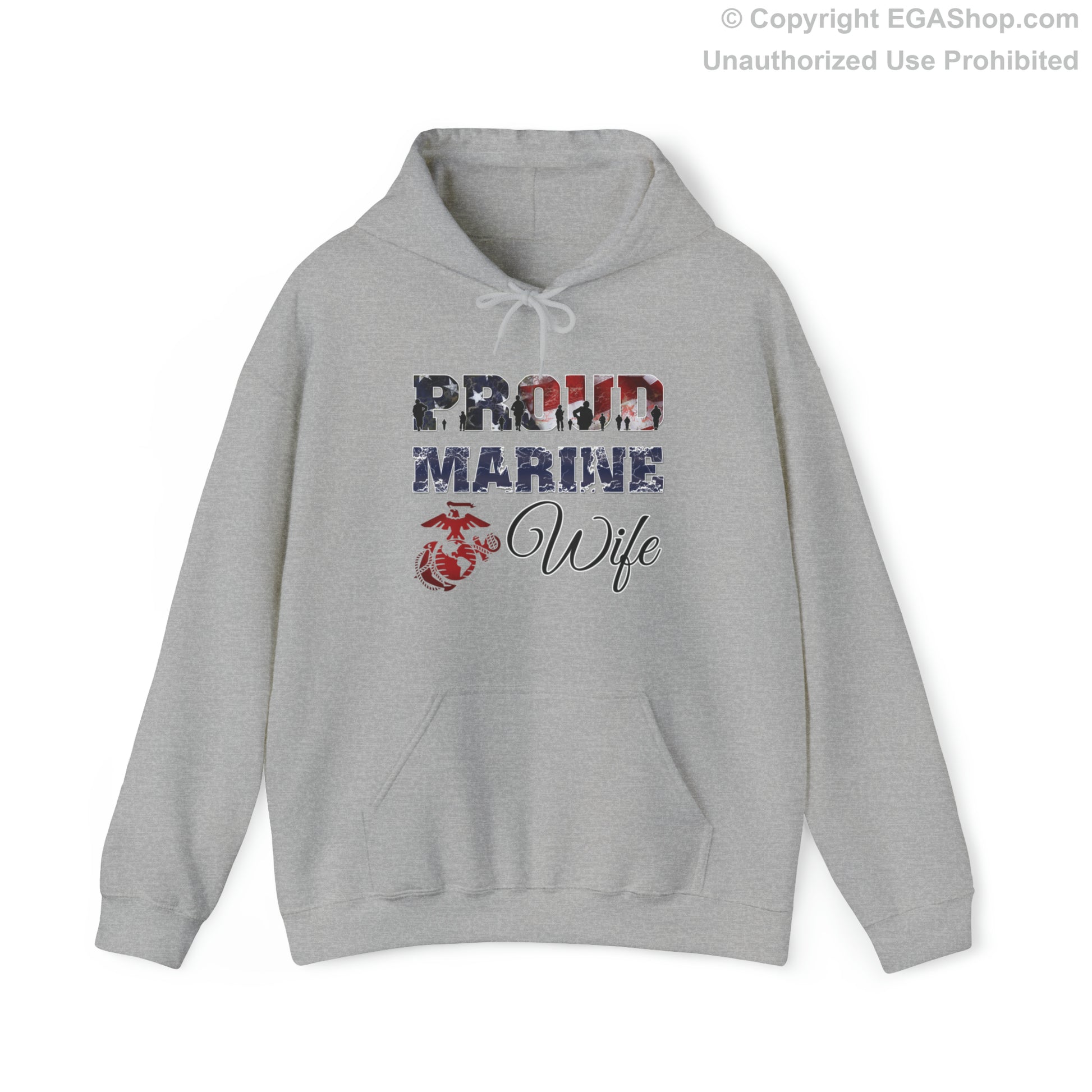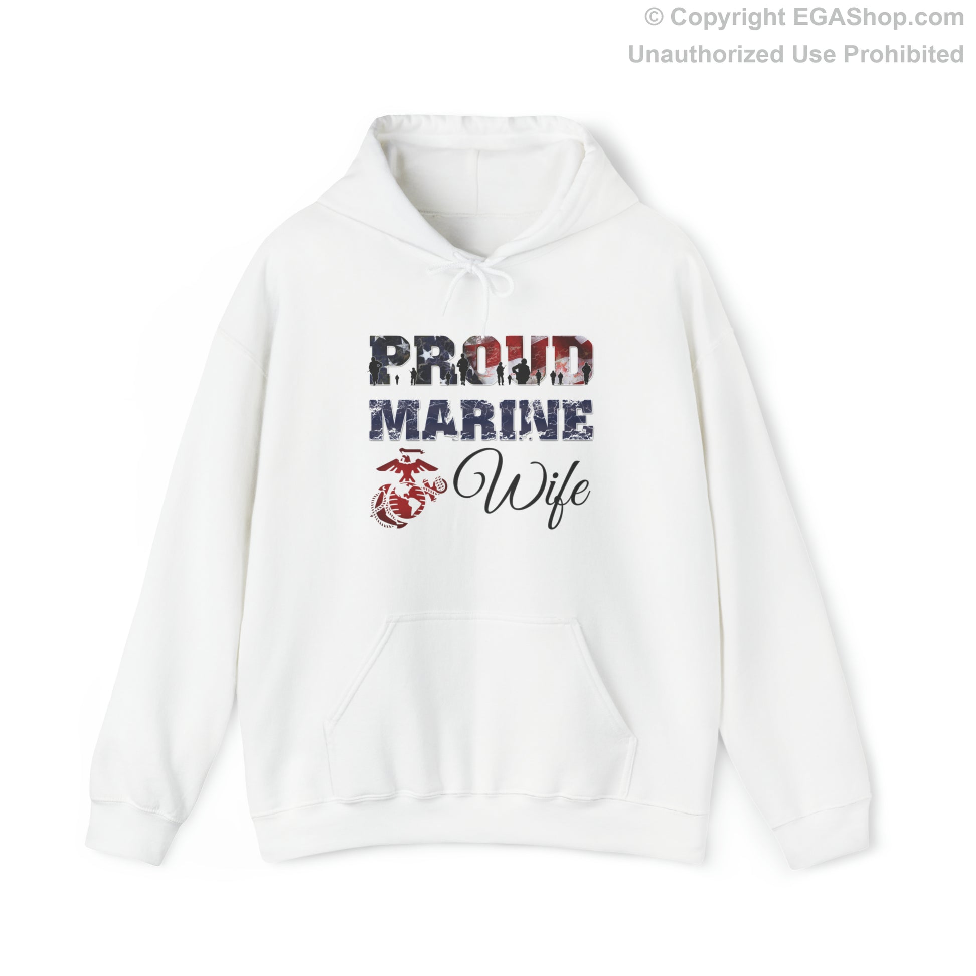 Our Proud Marine Wife hoodie features the word PROUD as an American flag with silhouettes of Marines in front; below is the word MARINE Wife next to a red Eagle, Globe, and Anchor (EGA). The EGA is muted on darker color fabric. The back is blank. In your choice of colors. An EGA Shop exclusive.