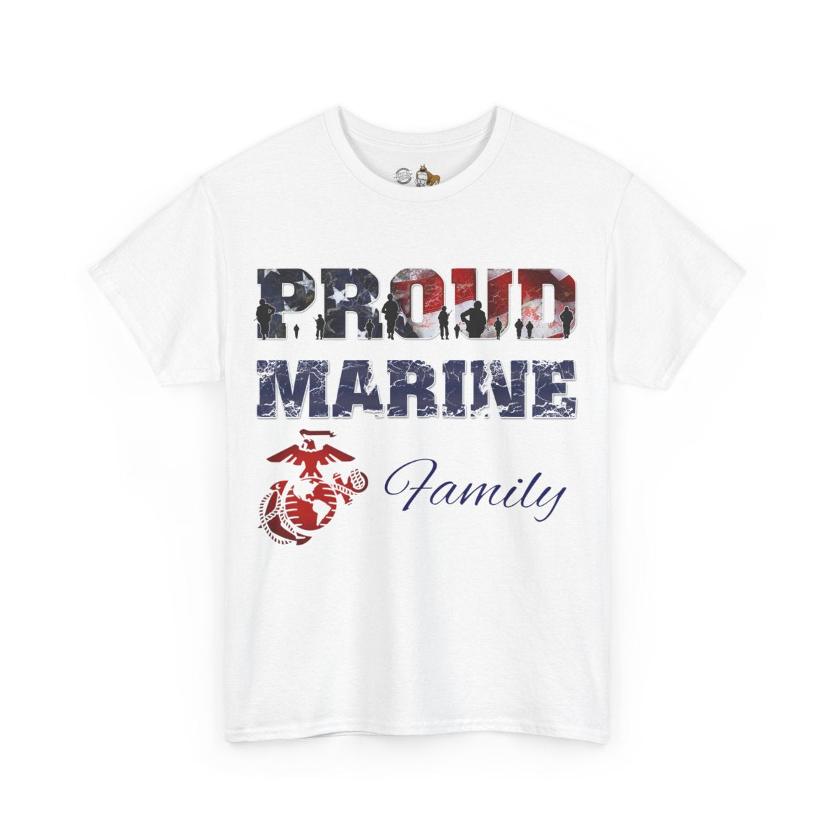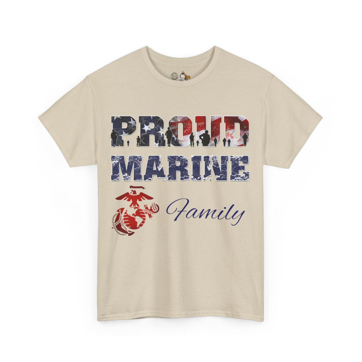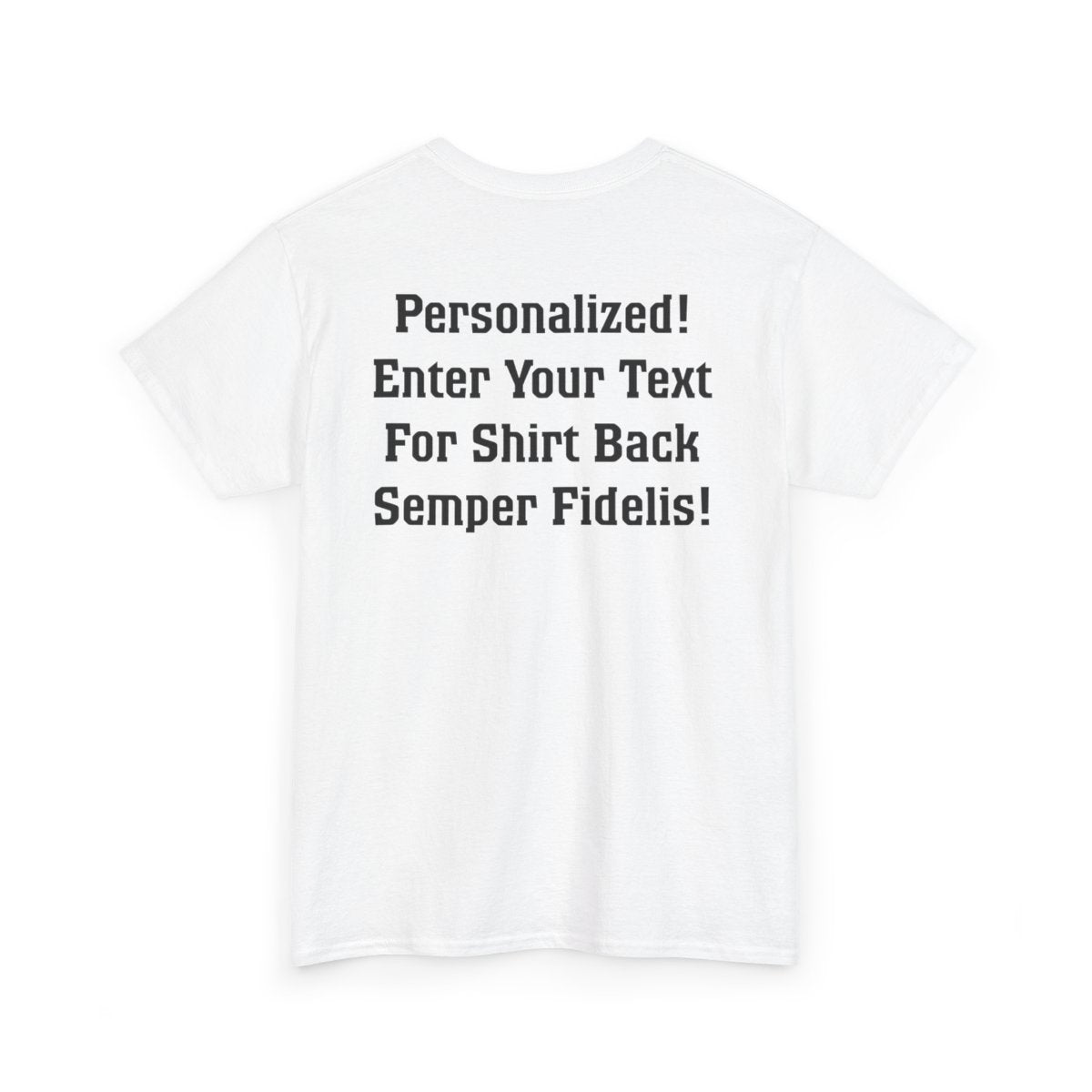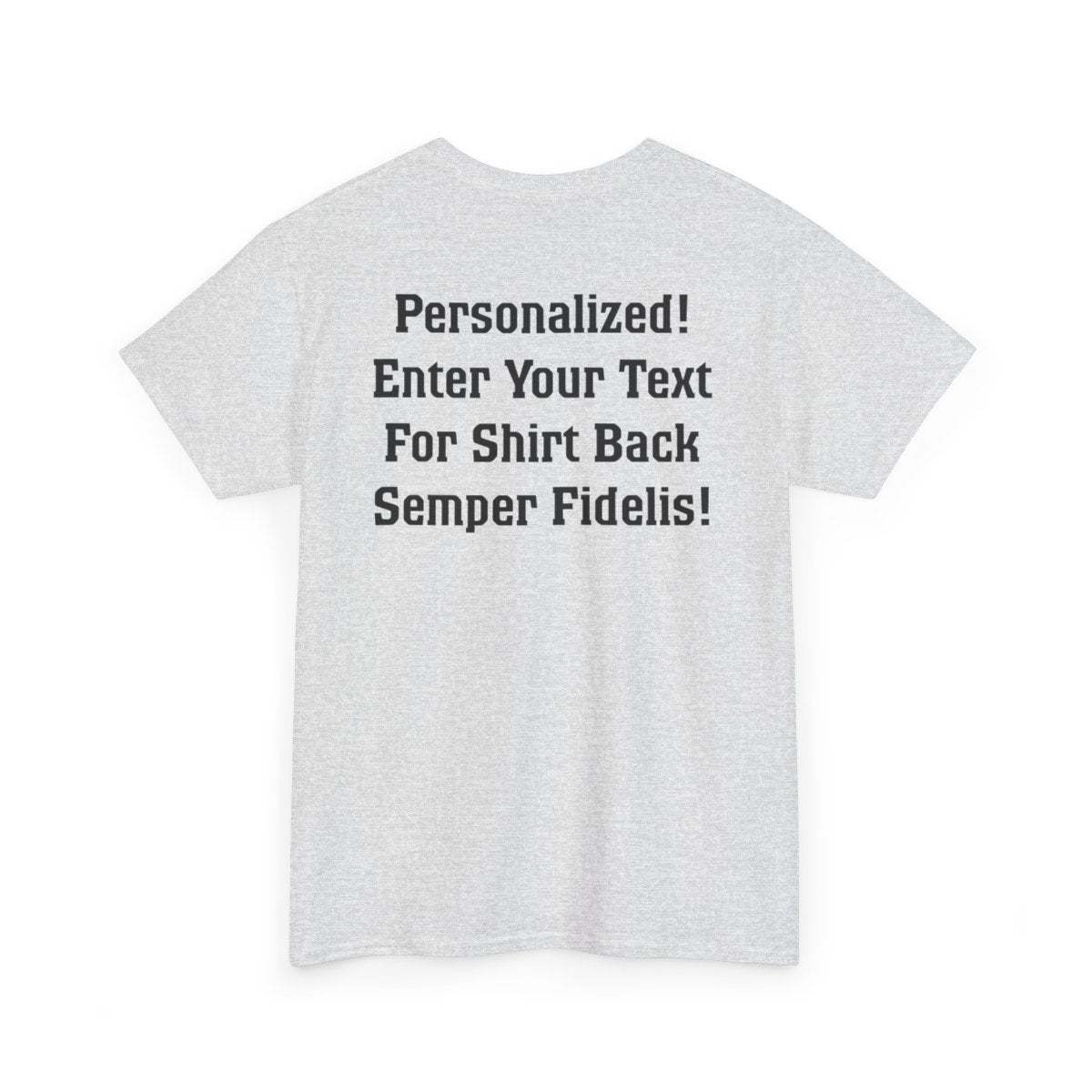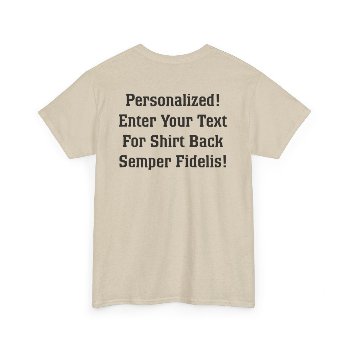 Personalize the FRONT and BACK of this Marine Family T-shirt! This is our adult, unisex size and fit. The front of the shirt features the Eagle, Globe, and Anchor with Proud Marine. You enter the family affiliation on the front: Mom, Dad, Nanna, Sissy, Step Mom, etc. It's your choice! Plus add from 1-4 lines of text for the back of the shirt! Character limit per line includes spaces. The choice of text is yours!