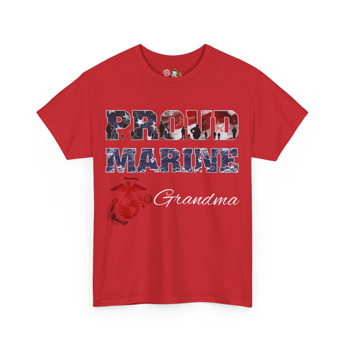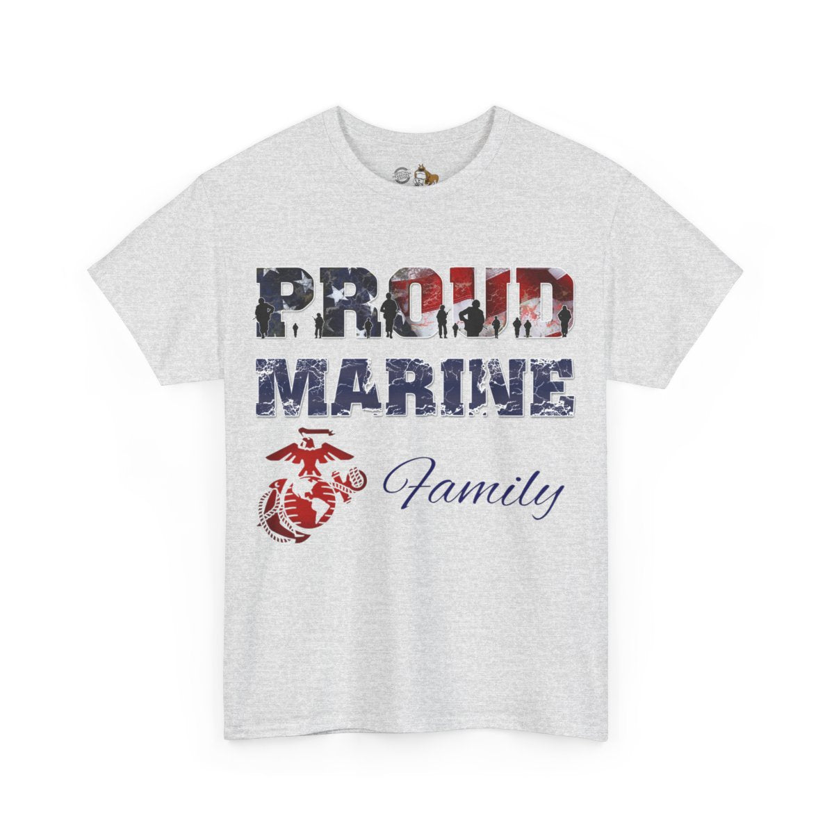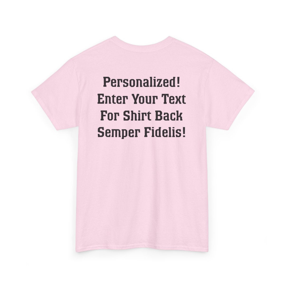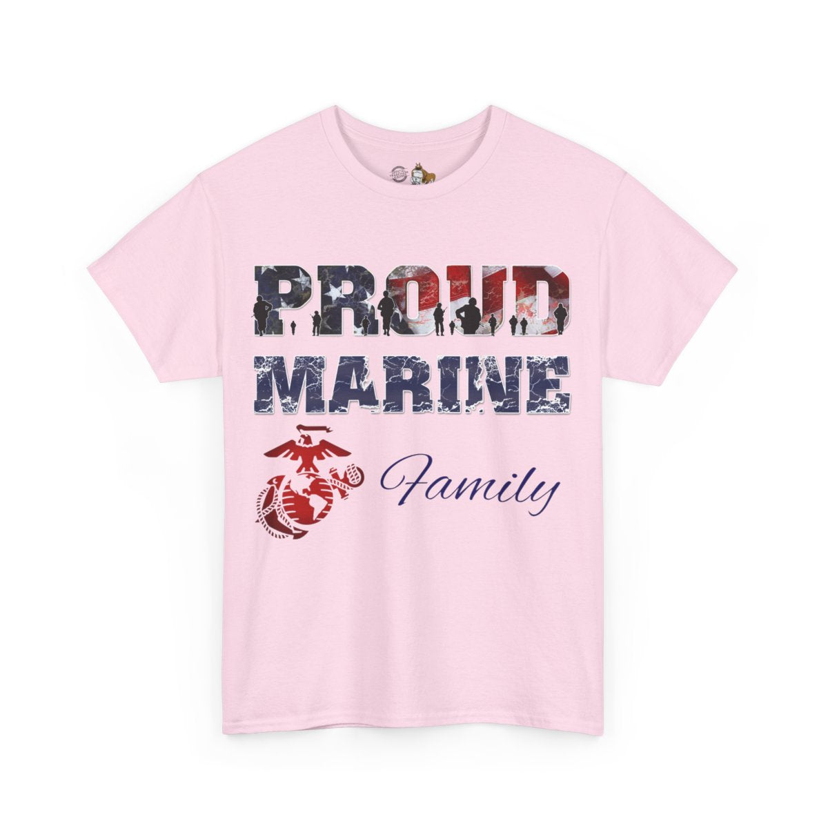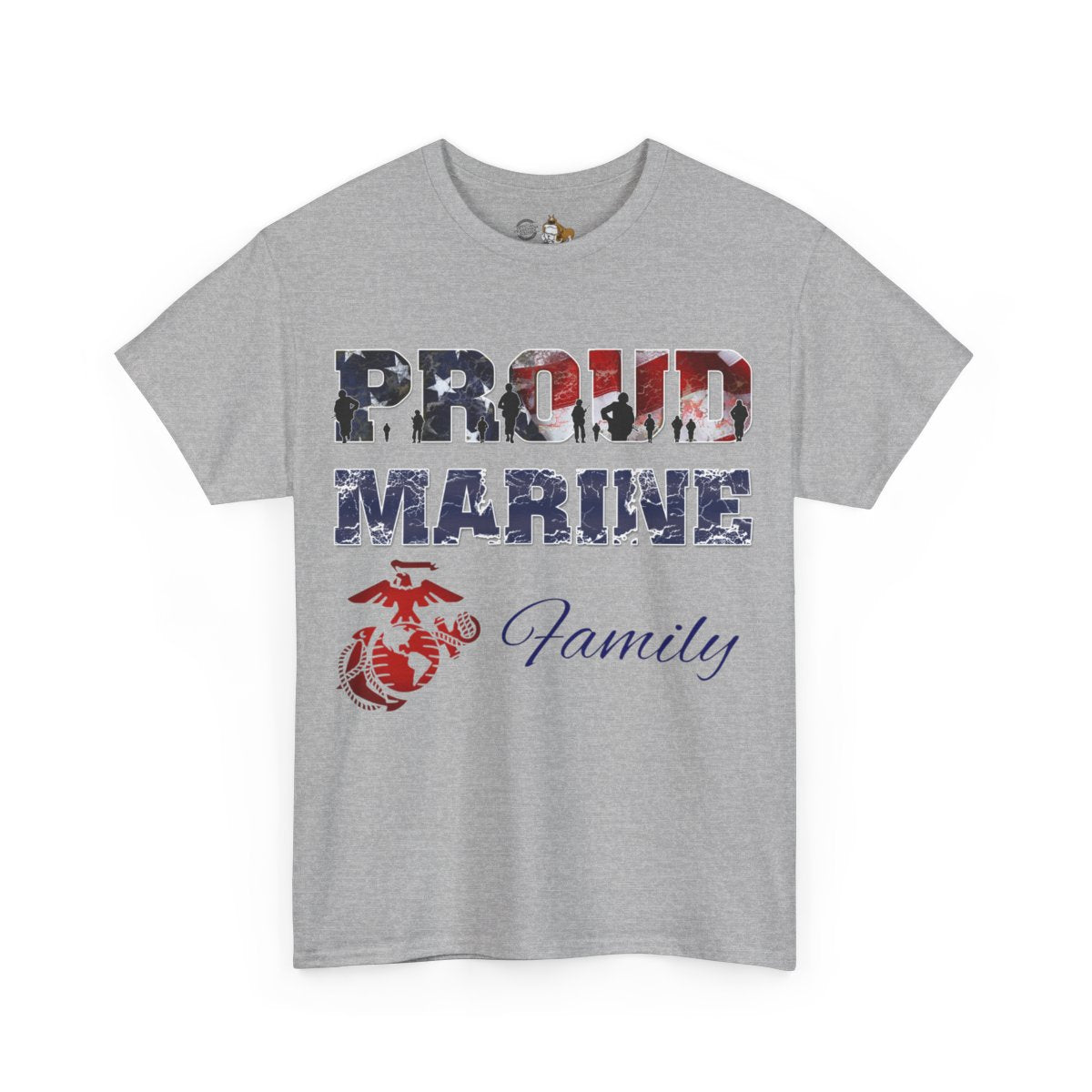Personalize the FRONT and BACK of this Marine Family T-shirt! This is our adult, unisex size and fit. The front of the shirt features the Eagle, Globe, and Anchor with Proud Marine. You enter the family affiliation on the front: Mom, Dad, Nanna, Sissy, Step Mom, etc. It's your choice! Plus add from 1-4 lines of text for the back of the shirt! Character limit per line includes spaces. The choice of text is yours!