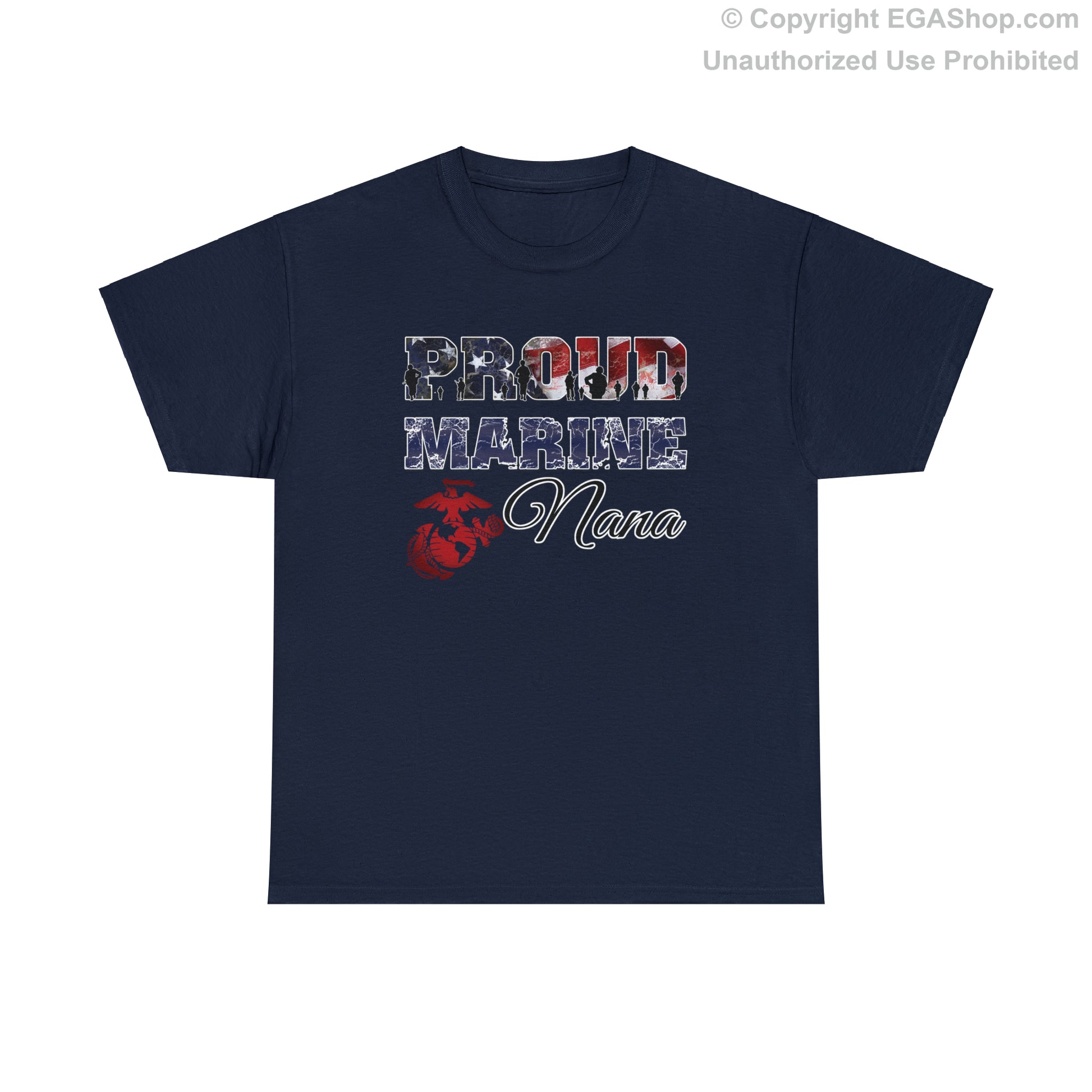Our Proud Marine Nana T-shirt features the word PROUD as an American flag with silhouettes of Marines in front; below is the word MARINE Nana next to a red Eagle, Globe, and Anchor (EGA). The EGA is muted on darker color fabric. The back is blank. Short sleeve. In your choice of colors. An EGA Shop exclusive.