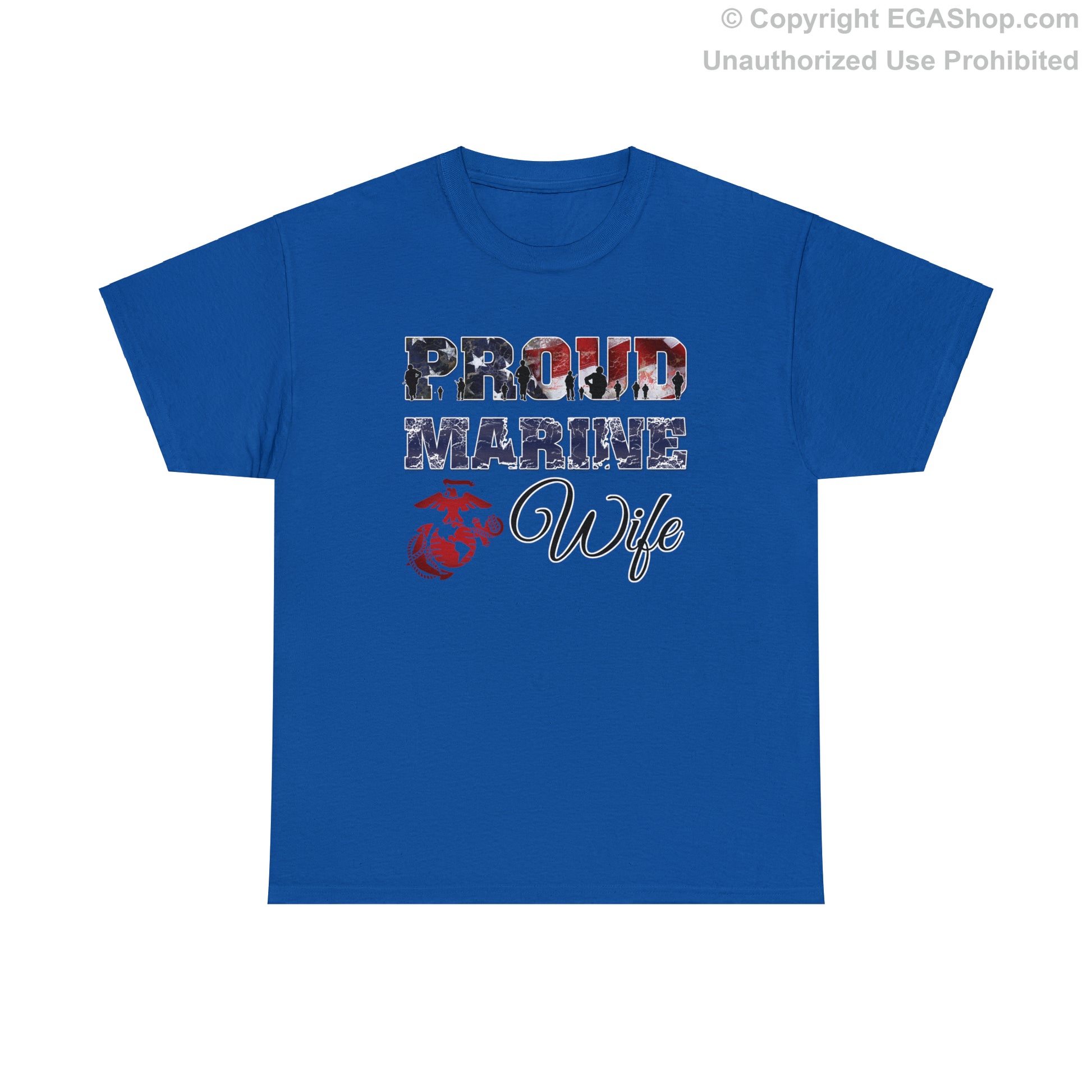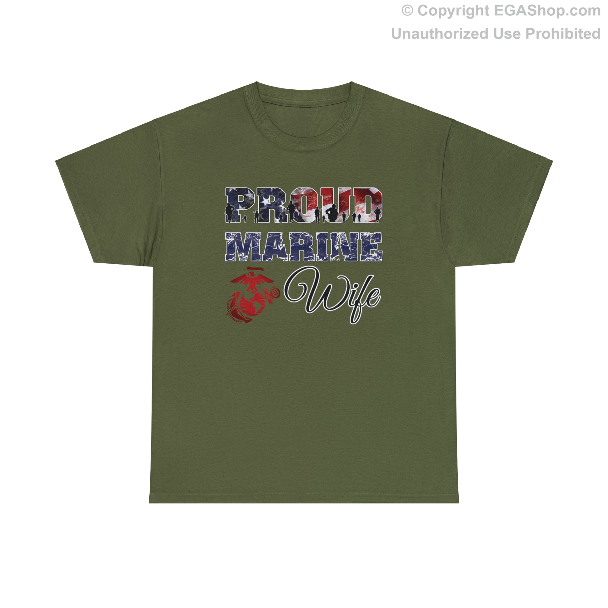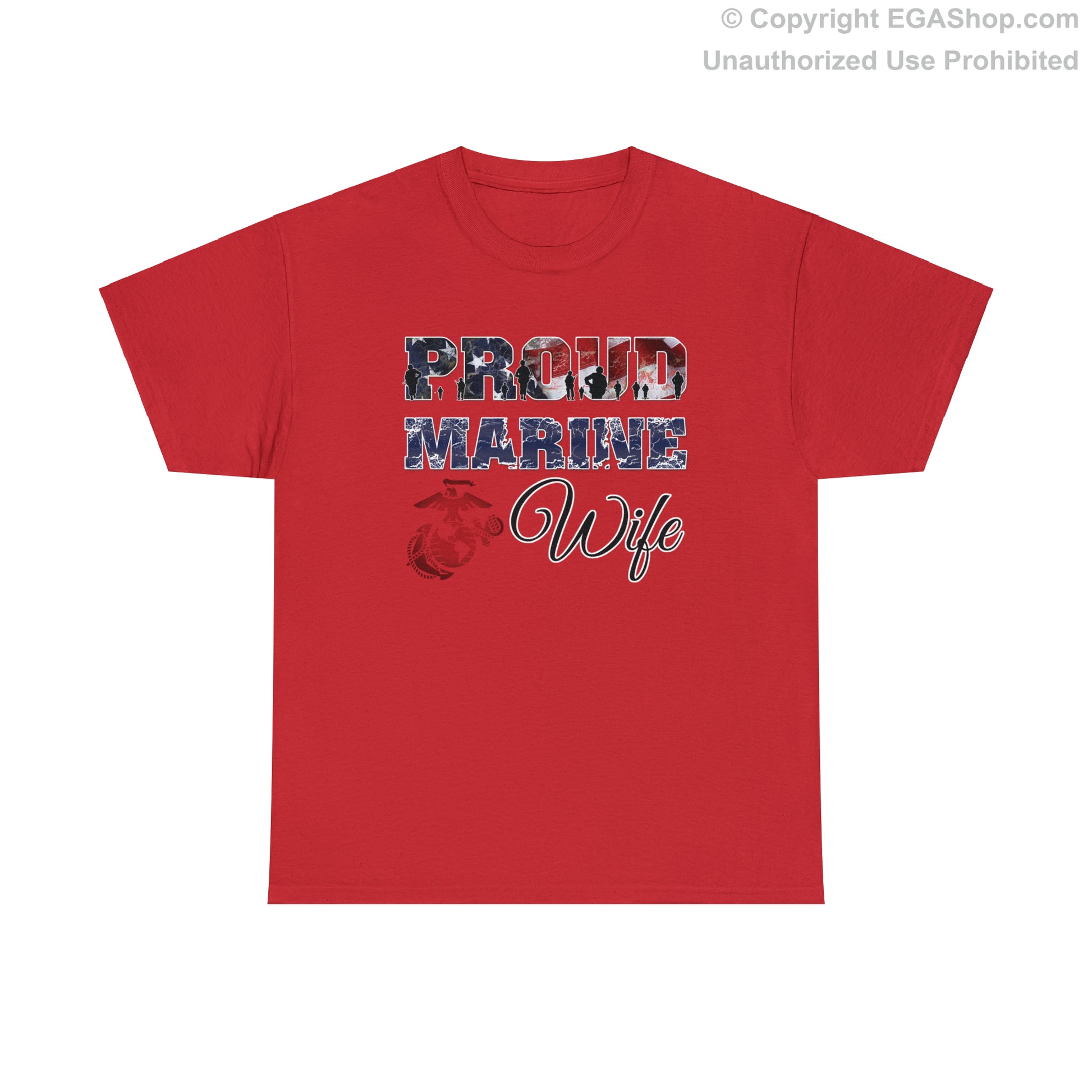 Our Proud Marine Wife T-shirt features the word PROUD as an American flag with silhouettes of Marines in front; below is the word MARINE Wife next to a red Eagle, Globe, and Anchor (EGA). The EGA is muted on darker color fabric. The back is blank. Short sleeve. In your choice of colors. An EGA Shop exclusive.